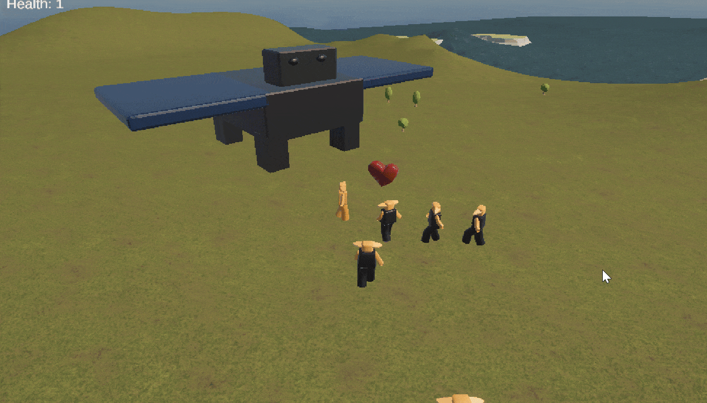 I created a simple chunky heart with the Probuilder tools in Unity, and made this my health pack. I also made it rotate and periodically grow in size, to make it look more enticing. Rather than have the health pack heal a set amount, I made it so that it heals the player to full health upon pickup.